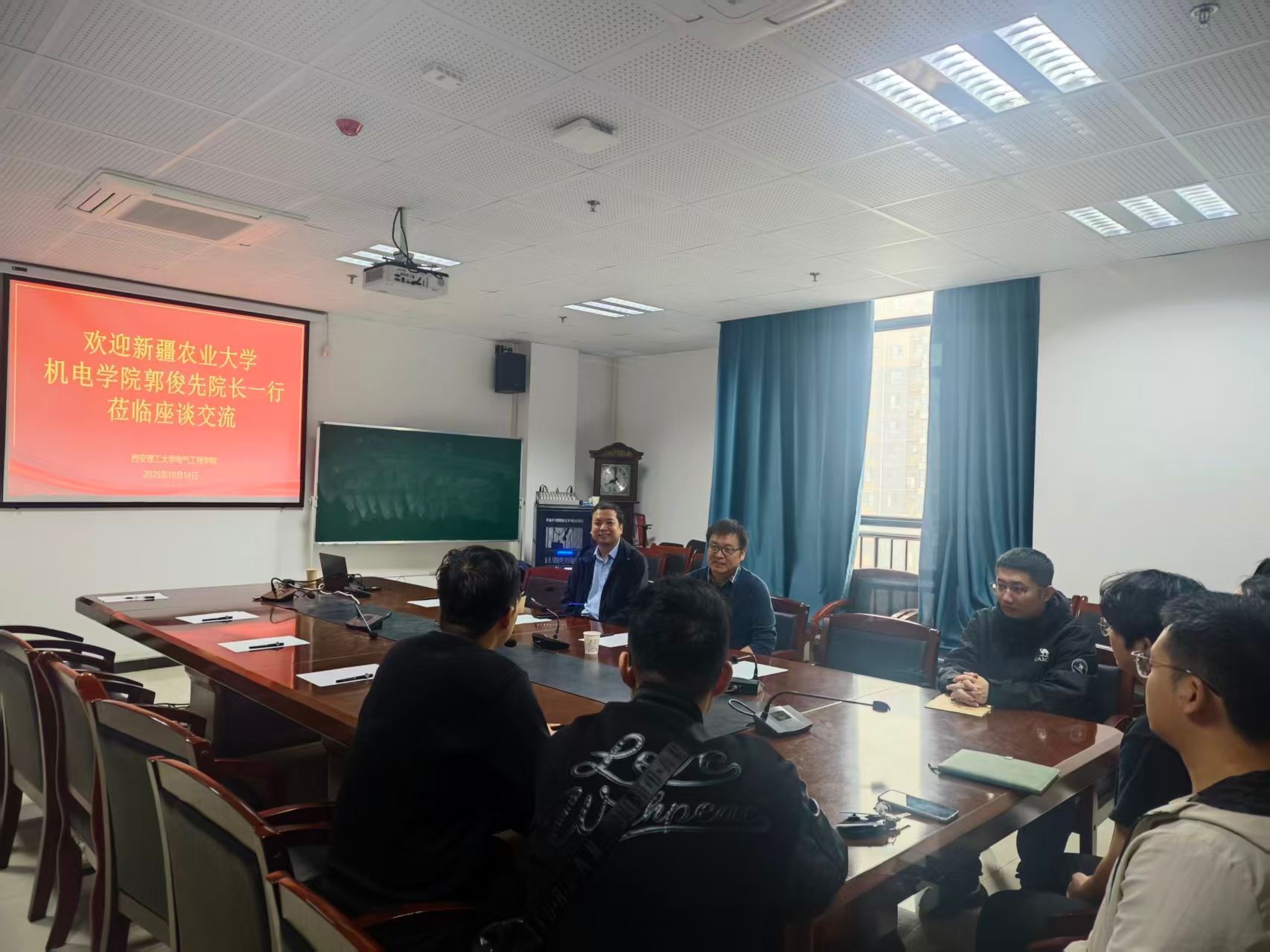 为加强学院(学科)交流合作,深化高层次人才培养与引进,助力“双一流”建设,2025年10月14日上午,新疆农业大学机电工程学院(新能源学院)院长郭俊先一行到访电气工程学院,就学科专业建设、科研合作、博士人才培养与引进开展调研交流。电气工程学院院长贾嵘、副院长宋卫章和来宾进行座谈。