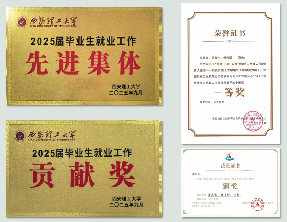 就业质量显成果:2025年毕业生去向落实率96.07%,位列全校第一。306人进入国家电网、南方电网、国家能源集团、华能、华电、大唐、国电投、中广核、三峡集团、中国西电等央国企所属企业,其中进入电网公司214人,占毕业生人数38.2%,国网陕西公司招录人数全国第一;82人进入特变电工、汇川技术、维谛技术等行业龙头企业。本科生116人继续深造,占比31.96%,其中75人升学本校,34人被西安交通大学、华北电力大学等“双一流”院校录取。学院获校就业工作先进集体、就业工作贡献奖,1人获第二届全国大学生职业规划大赛全国总决赛铜奖。