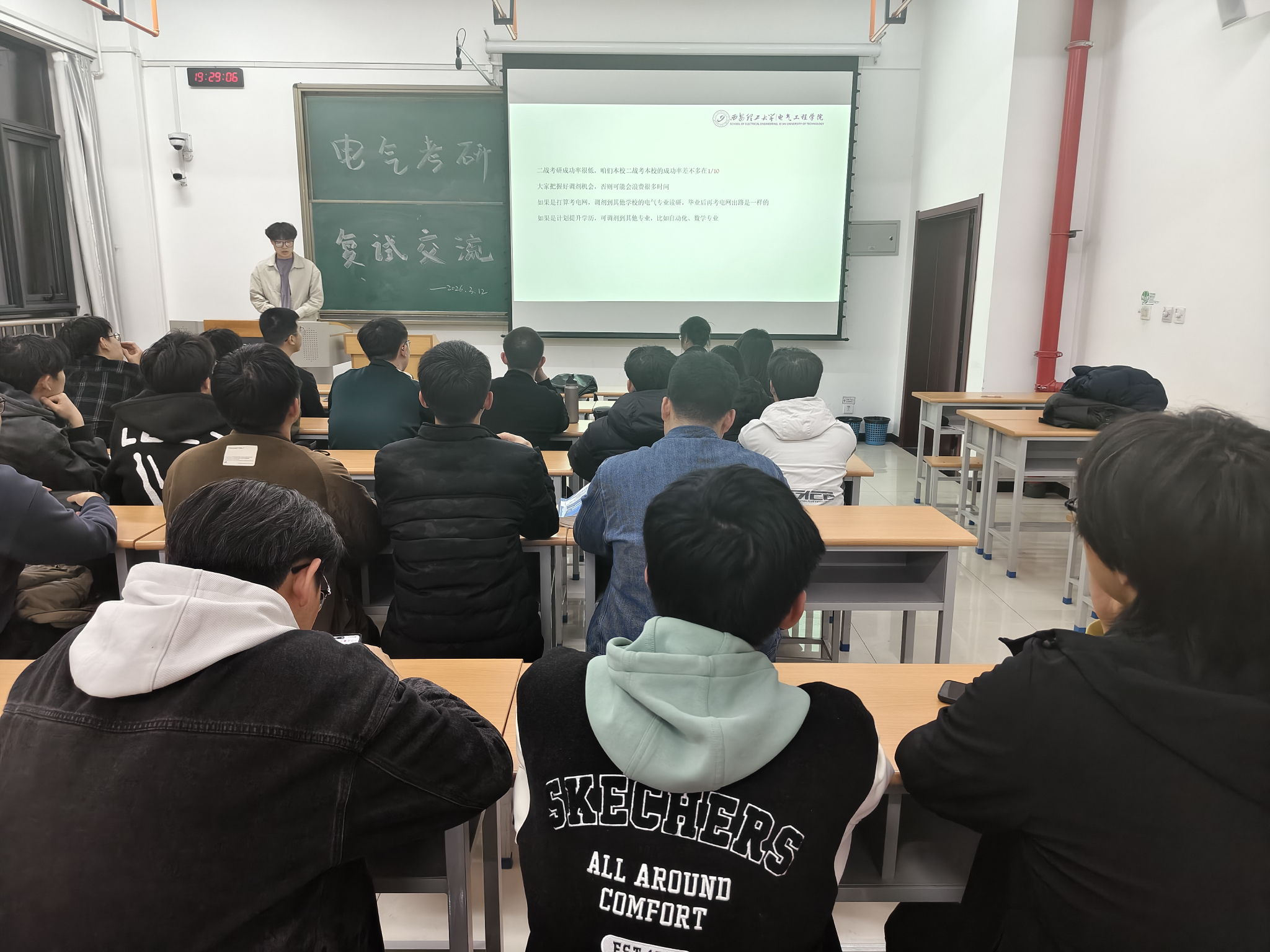 分享环节中,刘梦娜率先聚焦复试全流程筹备,详细梳理了考前资格审查的材料清单,提醒同学们做好时间规划,保持良好备考心态。随后,周雯将分享重点放在复试三大核心考核板块的备考细节上,并强调回答问题时诚实大方的态度远比完美答案更重要。王鑫华结合自身学硕复试的经历,补充了英语面试的实战技巧与调剂相关知识。最后,最后,李琦鑫围绕综合素质面试与调剂细节展开了细致分享,并整理了继电保护、电机学、电路等学科的高频考点。