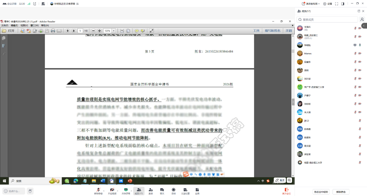 为做好2026年度国家自然科学基金申报最后阶段的冲刺工作,提升申请书质量与竞争力,电气工程学院电网系于2026年2月26日在线上召开第十二次申报推进会。副院长段建东教授、系主任刘兴华教授全程参会,并对每一份申请书进行详细点评。系科研主任杨磊教授主持会议,全系申报基金的14位教师逐一进行汇报。